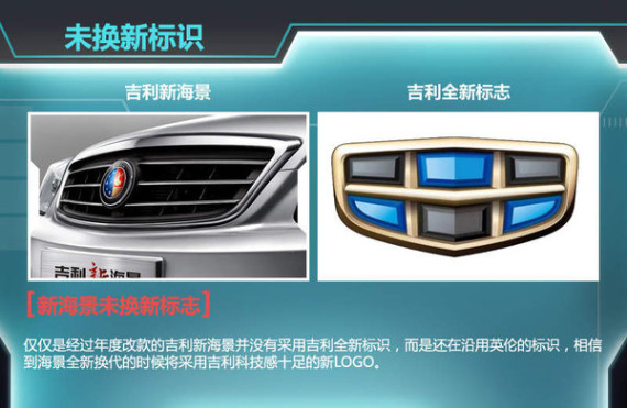 去年北京车展上吉利汽车在深化平台化战略、打造精品车型的策略指引下,吉利汽车发布全新品牌架构,将帝豪、全球鹰、英伦三品牌归一,汇聚为统一的吉利品牌,并采用全新的品牌LOGO,重新布局品牌战略。仅仅是经过年度改款的吉利新海景并没有采用吉利全新标识,而是还在沿用英伦的标识,相信到海景全新换代的时候将采用吉利科技感十足的新LOGO。
