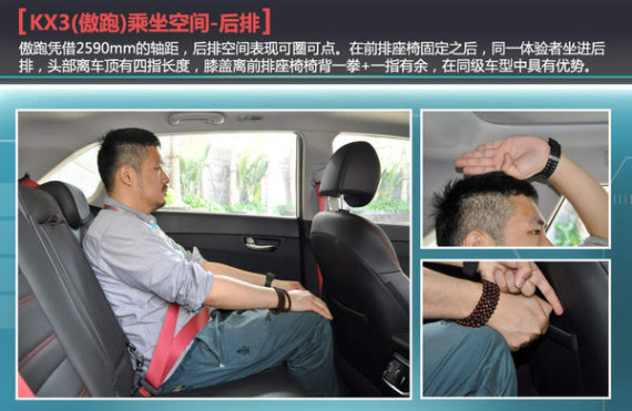 在乘坐空间上,东风悦达起亚傲跑体现出了它长轴距的优势。笔者邀请同行实际体验了一把,身高176cm的体验者在驾驶席坐姿调整好后仍有一拳有余的头部空间;在此前提下,该体验者坐进傲跑的后排,膝盖位置距离前排座椅靠背拥有1拳1指的长度有余,头部也拥有四指长度的空间。