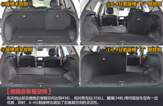 在后备箱储物空间上,东风悦达起亚傲跑相对较大,官方给出的数据为436L,与在同级别中后备箱容积算大的“同门兄弟”-北京现代ix25(431L)相比,傲跑显然更有诚意。与此同时,傲跑所提供的6-4比例分割式座椅也为后备箱空间的灵活性提供保障,可轻松同时容纳多个行李箱、双肩包等物品。