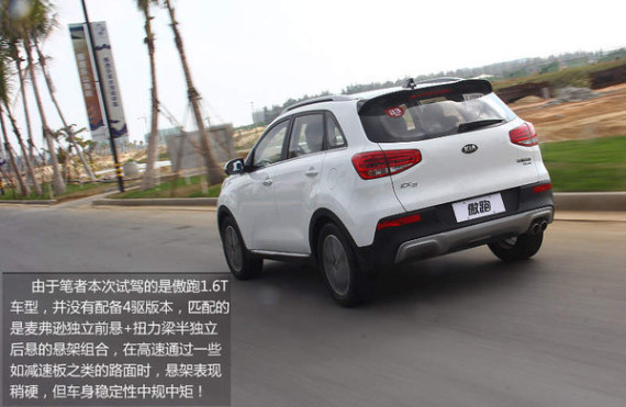东风悦达起亚这款全新小型SUV提供了两驱和四驱两种不同版本作为选择,但从车型分布来看,仅顶配车型(即2.0L 4WD)一款提供带锁止功能的四驱,其余车型则均为前置前驱,两种不同驱动模式所配备的悬架组合也不相同(前驱车型为麦弗逊独立前悬+扭力梁半独立后悬;四驱车型为麦弗逊独立前悬+多连杆独立后悬)。尽管如此,傲跑所表现出的通过性以及车身稳定性均保持较好的状态。