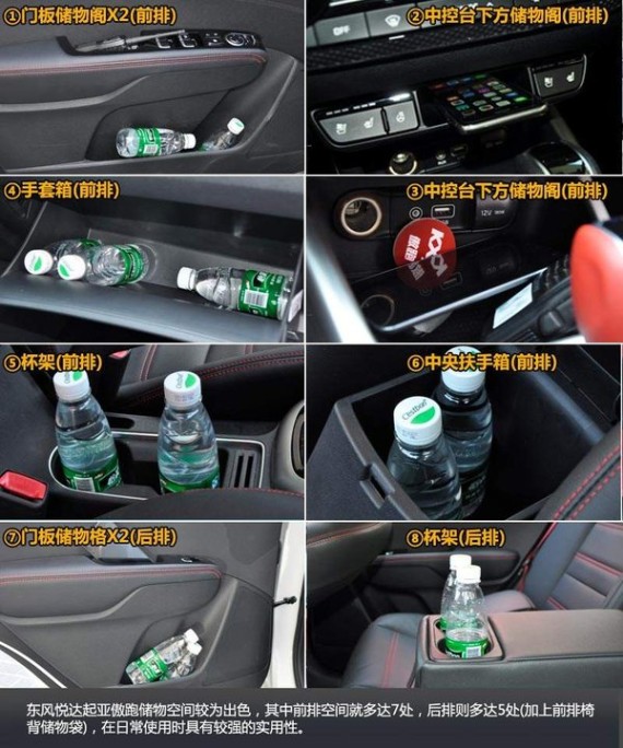 东风悦达起亚傲跑乘坐空间表现可圈可点之余,储物空间也是以满足家用需求为主,其中前排储物空间多达7处,足以容纳日常驾驶中所需物品,包括票据、手机、饮用水等等,后排储物空间也是中规中矩,门板水槽、储物阁、杯架、前排椅背储物袋等等一应俱全。