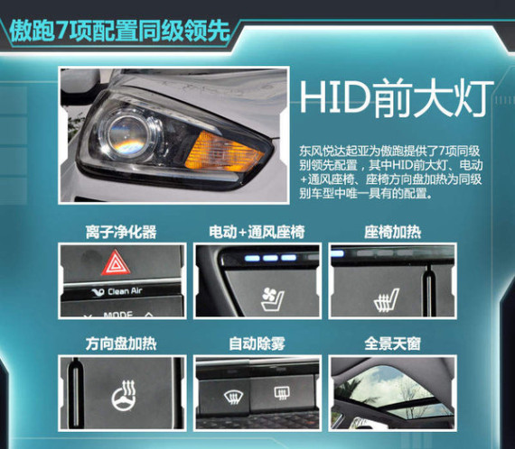 与此同时,在国内消费者眼中对于韩系车型的第一印象便是配置高,这一点也在东风悦达起亚为傲跑上得以体现。傲跑不仅采用了LED雾灯、电动座椅调节,安全气囊/侧气帘等多项常规配置,同时,还添加了HID前大灯、离子净化器、电动+通风座椅、座椅加热、方向盘加热、自动除雾、全景天窗共7项同级别领先配置,这也是为什么第一张图上有7颗五角星的原因。其中HID前大灯、通风座椅、方向盘加热为同级别中唯一具有的配置,从中可看出以舒适性配置居多。