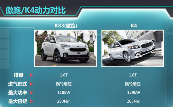 东风悦达起亚旗下目前仅有K4一款车型搭载全新1.6T发动机,最大输出功率为129kW,峰值扭矩则可达265Nm,傲跑所匹配的1.6T引擎则在此基础上进行了调校,最大功率则是118kW,最大扭矩为250Nm,算是1.6T低功率版本。有意思的是,K4所匹配的1.6T GDi发动机中的字母“i”为小写,傲跑所采用的1.6T发动机则是大写。