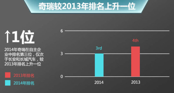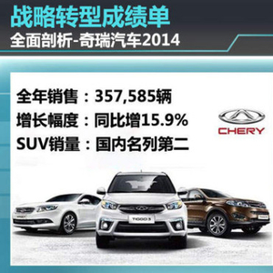 2014年对于奇瑞汽车而言,是战略转型后的第二年,同时也是企业进入实现快速发展的一年。根据奇瑞汽车公布官方数据:2014年奇瑞集团(控股)销量达494,824辆,其中狭义乘用车(不含微面)的销量为460,504辆,在国内自主品牌中销量排名第三名,仅次于长安和长城汽车。相比2013年而言,奇瑞汽车在国内自主品牌销量第四名的位置,提升至2014年的第三位。