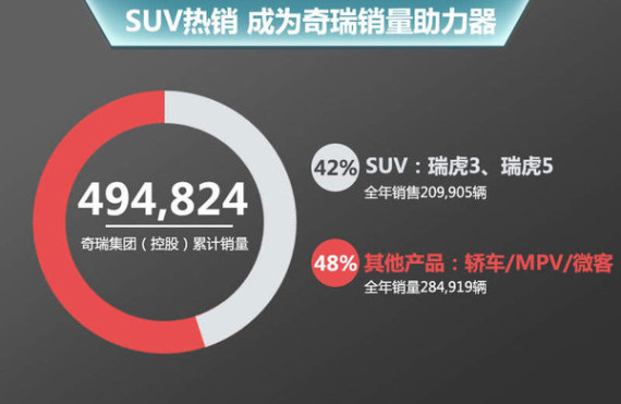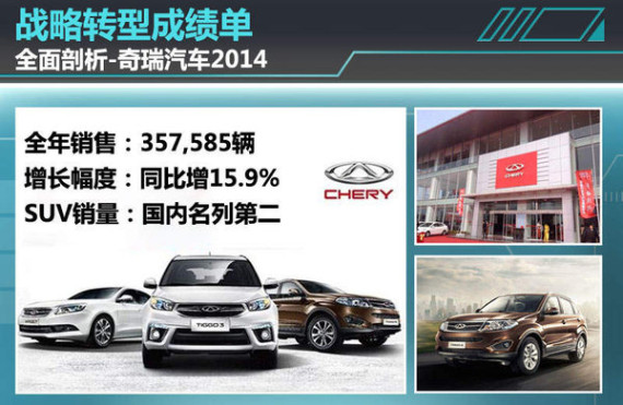 大数据层面能够看出2014年,奇瑞交出了一幅令自己满意的年终成绩单。当然,能够取得这样的销量成绩,无疑离不开出众的产品。在2014年奇瑞在初步整合成艾瑞泽、瑞虎、风云、QQ四大系列的基础上,推出家族系列下的新产品,如瑞虎3、艾瑞泽3等新车。其中依托瑞虎5和瑞虎3两款SUV的热销,全年在SUV车型上销量达到209905辆,同比增长116.6%,国内自主品牌中名列第二,成为去年奇瑞汽车销量增长的关键。