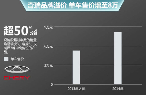 然而销量并不是衡量一家企业的关键,同时也要关注企业的自身实力。在刚刚过去的2014年,奇瑞汽车在经营质量上有着飞跃性的提升。从过去QQ、风云等低价位产品销量占比近8成,现阶段超过半数的销量均是瑞虎3、瑞虎5、艾瑞泽7等中高价位的产品。这样的差别体现在单车售价方面,令奇瑞从过去的5万元提升至8万元,成功实现奇瑞品牌的溢价,脱去了“廉价车”的帽子。