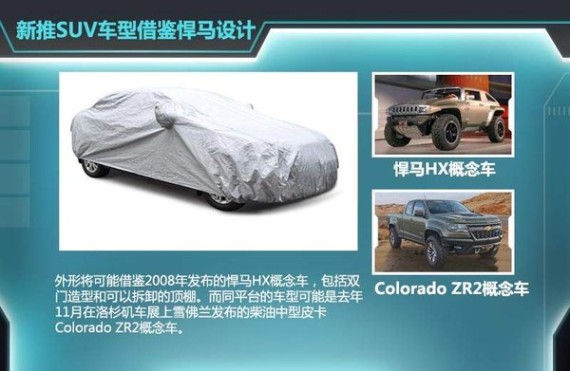 据悉,新车的外形将借鉴2008年发布的悍马HX概念车,这款车是双门造型。其顶棚可以拆卸,这也是硬派SUV的经典设计元素。据了解,为了降低研发成本,这款车将会与通用旗下的其他车型同平台打造,而同平台的车型或许是去年11月在洛杉矶车展上雪佛兰发布的柴油中型皮卡- Colorado ZR2概念车。