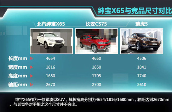 绅宝X65作为一款紧凑型SUV,其长宽高分别为4654/1816/1680mm,轴距达到2670mm,与其竞争对手长安CS75以及瑞虎5相比这个尺寸并不突出,但是评价一款新车,仅仅看它的尺寸是不够的,外观,性能等也是一样重要。