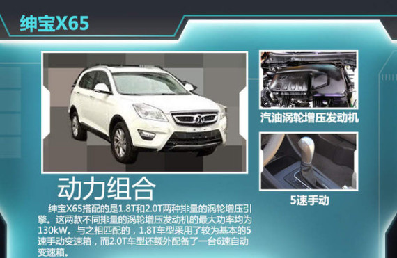 动力方面,绅宝X65搭配的是1.8T和2.0T两种排量的涡轮增压引擎。值得一提的是,这两款不同排量的涡轮增压发动机的最大功率均为130kW。传动系统上,1.8T车型采用了较为基本的5速手动变速箱,而2.0T车型还额外配备了一台6速自动变速箱。