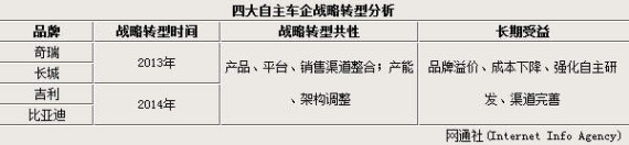 在自主品牌市场份额日益缩减的今天,上述四家车企分别在2013和2014年两个关键时间节点开展战略调整。其中,率先完成企业战略调整的是奇瑞和长城,转型时间为2013年;而吉利和比亚迪则稍晚一些,于2014年实现转型。