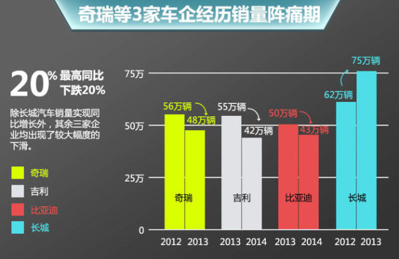 然而,企业在实施战略调整过程中要面对的困难显然是极大的,从这四家车企的市场后续市场表现来看(奇瑞2013年年销48万辆,同比下滑13%;长城2013年同比上涨21%;吉利2014年年销42万辆,同比降幅超过20%;比亚迪2014年同比下滑14%)除长城汽车销量增长外,其余三家企业均出现了较大幅度的下滑,由此来看,经历一段时间的销量阵痛期似乎难以避免。