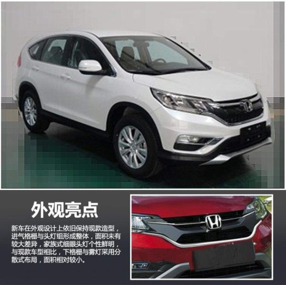 新车在外观设计上依旧保持现款造型,进气格栅与头灯组形成整体,面积未有较大差异,家族式细眼头灯个性鲜明,与现款车型相比,下格栅与雾灯采用分散式布局,面积相对较小。在尾部造型上,新款CR-V与现款相比并未大幅改动,仅在雾灯两侧进行了加宽处理,且车尾厂徽处添加了大面积镀铬饰板,与现款相区别。