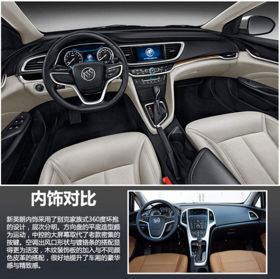 同外观一样,新英朗内饰的变化也可以用“颠覆”来形容。采用了别克家族式360度环抱的设计层次分明,令人耳目一新。方向盘的平底造型颇为运动,中控的大屏幕取代了老款密集的按键,变得简洁易操作。空调出风口形状与镀铬条的搭配显得更为活泼,木纹装饰板的加入与不同颜色皮革的搭配,很好地提升了车厢的豪华感与精致感。