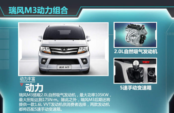 动力方面,瑞风M3搭载2.0L自然吸气发动机,最大功率105KW,最大扭矩达到175N·m。除此之外,瑞风M3后期还将提供一款1.6L VVT发动机供消费者选择,两款发动机都将匹配5速手动变速箱。