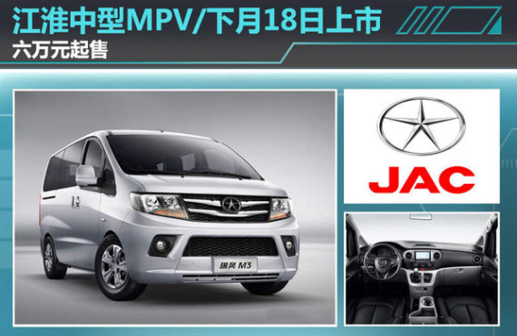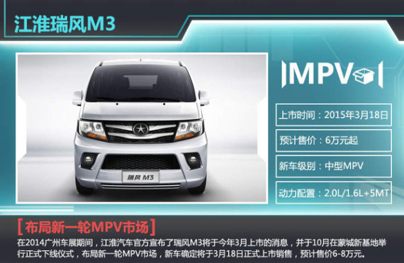 在2014广州车展期间,江淮汽车官方宣布了瑞风M3将于今年3月上市的消息,并于10月在蒙城新基地举行正式下线仪式,布局新一轮MPV市场。日前,媒体从江淮汽车官方获悉了新车的车型图片,同时了解到瑞风M3的具体参数,定位中型MPV,确定将于3月18日正式上市销售,预计售价6-8万元。