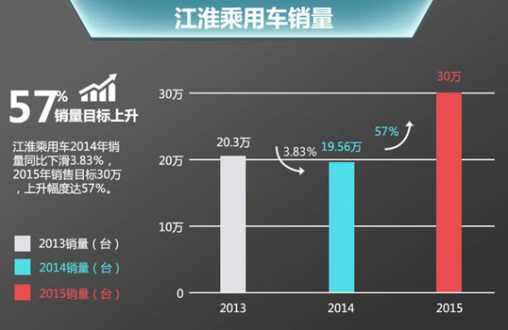 经历了去年江淮乘用车销量同比下滑3.83%后,并未对市场失去信心,江淮汽车股份有限公司乘用车营销公司总经理严刚曾表示:未来我们将致力于新产品的开发和在线产品的持续改善,最大限度地满足用户多元化、个性化的需求,拟将2015年乘用车的销售目标设定在30万辆,增幅达57%。