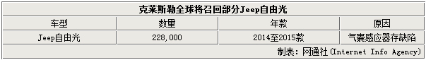 根据克莱斯勒公布的消息,此次全球召回的车型为2014至2015款Jeep自由光,共计有超过22.8万辆车受到影响,其中美国涉及召回数量最多,达到168,092辆,加拿大也将召回19,557辆车,墨西哥涉及4,133辆,此外,在北美以外的地区还有36,399辆车将被召回。