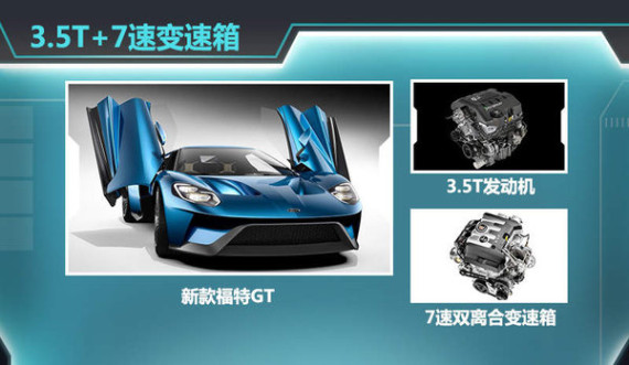 EcoBoost并不是福特的某一款发动机型号,而是集成涡轮增压、缸内直喷以及双独立可变气门正时系统三大技术的统称。福特目前涡轮增压车型均带有EcoBoost技术,排量涉及1.0T、1.5T、1.6T、2.0T、2.3T以及3.5T。新款福特GT搭载3.5L EcoBoost V6引擎,是福特最新设计的双涡轮增压产品,最大功率为447kW,是EcoBoost系列中动力最为强劲的发动机。与发动机匹配的是7速双离合变速箱,可为整车提供即时的换挡响应以及出色的驾控体验。