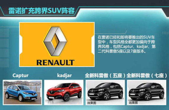 在雷诺的SUV阵营中,Captur是首先被推出的车型,其与第四代Clio相同,均基于日产-雷诺联盟的B平台打造,同时也是车身尺寸最小的一款SUV车型。即将与日内瓦车展上市的kadjar定位比Captur更高,因此车身尺寸也更大,在驱动形式上还提供两驱和四驱车型可选。由于kadjar与现款科雷傲车身尺寸近似,为与其拉开差距,所以全新一代科雷傲的车身尺寸更大,同时也是以上车型当中级别最高的车型。