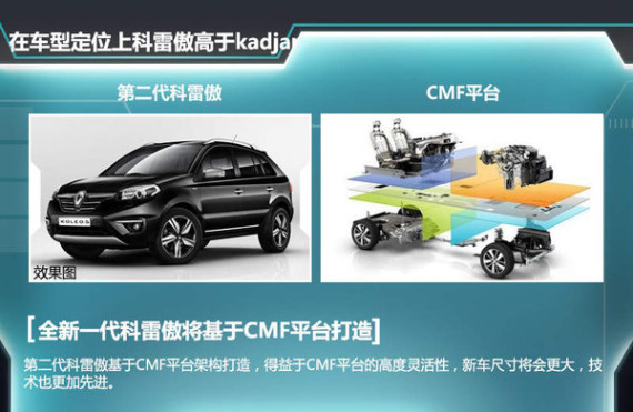 第二代科雷傲车型将基于日产-雷诺集团的CMF模块化平台打造,该平台可用于豪华车、SUV、小型货车等多种车型,目前日产奇骏就是基于该平台打造的产品。借助于CMF模块化平台的灵活性,全新科雷傲车尺寸将会更大,现款科雷傲长宽高分别为4522/1855/1704,而全新一代科雷傲的车身长度将达到5米级别,车内空间更大,因此使得第二代科雷傲可以推出三排七座版本车型。