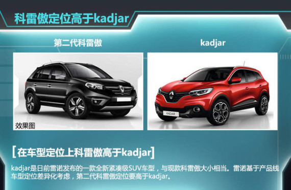 日前,雷诺刚刚发布了全新紧凑级SUV Kadjar,该车将在3月的日内瓦车展上市。Kadjar车身尺寸比现款科雷傲还要小一些,长宽高分别为4450/1840/1600mm。此前有传言Kadjar为科雷傲的替代车型,不过随着全新一代科雷傲的信息逐渐丰富,我们获知换代车型在雷诺SUV产品线中将仍然占据旗舰车型的地位。