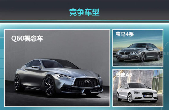 英菲尼迪Q60与家族旗下的四门轿车Q50基于同平台打造,可以看做是Q50的双门轿跑版。Q50竞争对手定位为宝马3系和奥迪A4来推测,而Q60的竞争对手主要锁定宝马4系以及奥迪A5。这两款车型已经上市一段时间,正逐渐被消费群体所熟知。因此,迅速推出Q60量产版以扩大知名度并参与竞争显得很有必要。