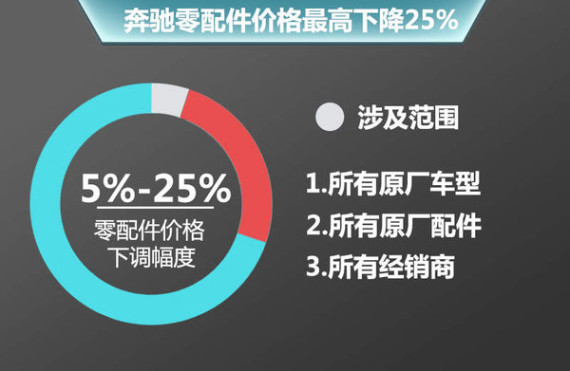 作为售后服务“新一年惠更好”的开年新举, 从2015年1月1日起,梅赛德斯-奔驰调整了全部零配件的厂商建议零售价格,全面覆盖所有梅赛德斯-奔驰乘用车(梅赛德斯-奔驰、AMG和smart)车型和各种零配件,全国所有授权经销商网点都将执行全新厂商建议零售价格,优惠幅度将达到5%-25%。这也是奔驰自去年7月开始,短短不到半年的时间内第三次降低售后服务价格。对于这样的改变,奔驰在华经销商将获得更多的实惠,进而吸引更多消费者关注奔驰品牌。