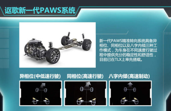 此外,在技术方面,讴歌不仅推出了8速双离合以及9AT变速箱,还推出了新一代PAWS四轮精准转向技术。该项技术共分为异相位、同相位和呈八字内倾三种工作状态,其中异相位主要帮助车辆在60km/h中低速行驶过程中的保持相应的稳定性,而同相位适用于在90km/h以上的高速行驶状态,实现对后轮束角(后轮左右轮转向角)的独立与随意控制,以最小的转弯半径、稳定的操控,同时与AHA系统紧密配合,带来转弯精准性、良好的操控性能和车身稳定性。但目前仅有TLX率先搭载,未来该技术将有望逐步在讴歌其他车型进行普及。