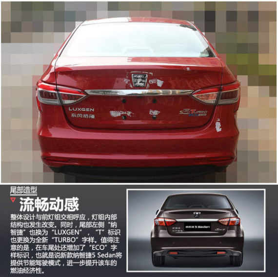 在尾部方面,新车同样在灯组造型上进行调整,整体设计与前灯组交相呼应,灯组内部结构也发生改变。同时,尾部左侧“纳智捷”也换为“LUXGEN”,“T”标识也更换为全新“TURBO”字样。值得注意的是,在车尾处还增加了“ECO”字样标识,也就是说新款纳智捷5 Sedan将提供节能驾驶模式,进一步提升该车的燃油经济性。