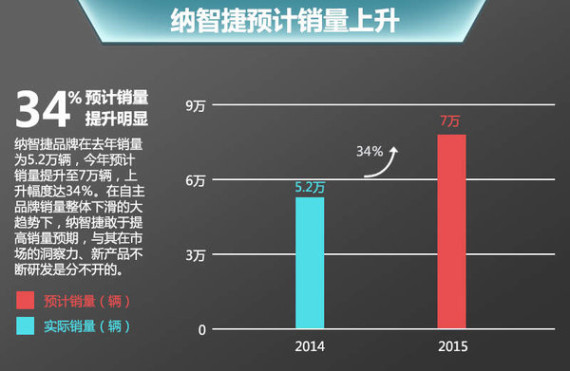 纳智捷品牌在去年销量为5.2万辆,今年预计销量提升至7万辆,上升幅度达34%。在自主品牌销量整体下滑的大趋势下,纳智捷敢于提高销量预期,与其在市场的洞察力、新产品不断研发是分不开的。东风裕隆有限公司营销部总部长单志东层表示:为冲击7万的销量目标,2015年纳智捷品牌将推出三个改款车型,从而进一步提升旗下产品竞争力。