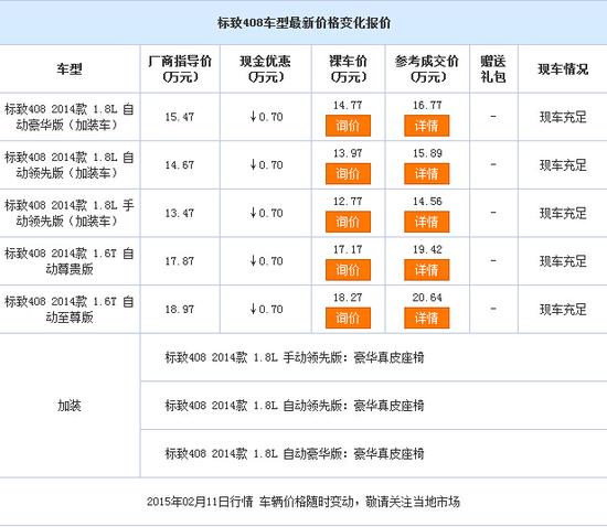 新浪银川汽车讯 近日,编辑从从东风标致宁夏标龙4S店获悉,标致408 (配置|询价)现车销售,颜色可选,目前购车部分加装车可优惠0.7万元,感兴趣的朋友可以到店咨询或电话垂询。
