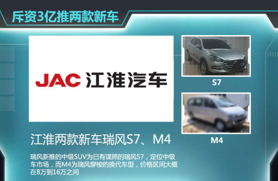 在江淮推出的两款车型中,瑞风S7为一款中型SUV,其竞争车型将是吉利豪情、比亚迪S6等自主品牌SUV。江淮M4作为瑞风穿梭的换代车型,定价应该还是维持在8万到15万这个区间范围内。网通社从江淮官方获悉,这两款车将会在2016下半年正式下线,有望于年底推向市场。
