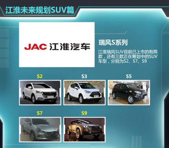 根据江淮汽车对未来的规划布局,其瑞风系列将来的覆盖面将会涉及到轿车、SUV以及MPV。其中SUV系列在瑞风这个品牌中算是刚刚起步,目前推出的两款SUV分别是瑞风S3和瑞风S5,这两款车型在中国小型SUV市场销售量最大的车型,其中瑞风S3月销量超过了2万台。未来瑞风还会拓展SUV产品阵容,推出瑞风S2、S7以及中大型SUV瑞风S9,非常值得国人期待。