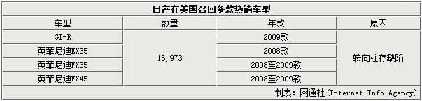 根据NHTSA公布的消息,此次在美国召回的车型是2009款GT-R、2008款英菲尼迪EX35,以及2008至2009款英菲尼迪FX35和FX45,共涉及16,973辆车。日产官方表示,目前尚未收到上述召回车辆引发的相关事故报告,召回将于近期展开。