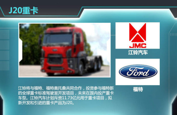 近年来江铃汽车与福特的合作已不再限于轻型商用车产品,双方在SUV及重卡领域的合作也在逐步推进。江铃汽车股份有限公司董事长王锡高表示:“我们将会和福特联手引进福特在欧洲以及在全世界比较先进的重卡产品。”近日,江铃汽车官方发布,江铃将投资11.73亿元用于J20重卡项目,通过参与福特新的全球重卡标准驾驶室开发项目,匹配福特底盘和发动机技术,开发或引进重卡产品。