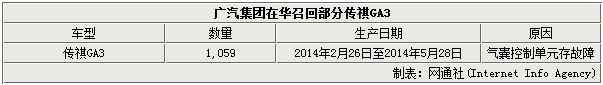 根据质检总局公布的信息,此次召回涉及部分传祺GA3轿车,其生产日期范围是2014年2月26日至2014年5月28日,召回共计1,059辆车。