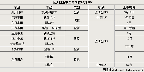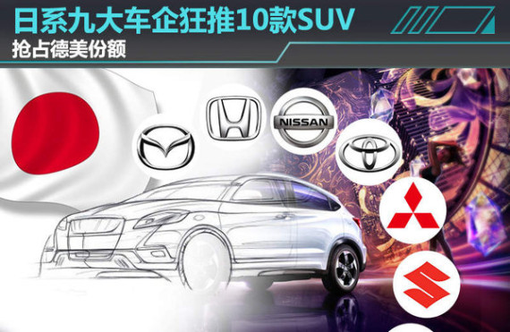 在目前增速超过30%的中国SUV细分市场,日系车正加快布局。媒体近期在整理汇总日系品牌新车规划时发现:今年长安马自达、广汽丰田、广汽本田、东风本田、三菱中国、铃木中国、长安铃木、东风日产及郑州日产在内的九大日系车企将陆续推出10款SUV车型,抢占更多德系美系在华市场份额。