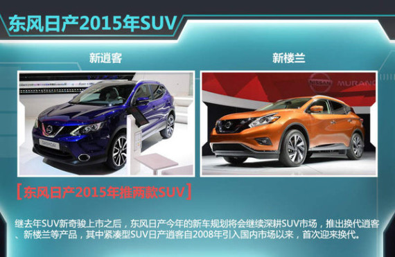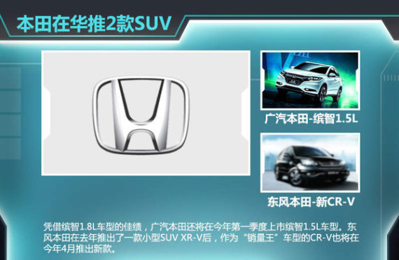 凭借缤智1.8L车型的佳绩,广汽本田还将在今年第一季度上市缤智1.5L车型。东风本田在去年推出了一款小型SUV XR-V后,作为“销量王”车型的CR-V也将在今年4月推出新款。广汽丰田也表示其中大型SUV汉兰达中期改款新车将于今年推出。另外,继去年SUV新奇骏上市之后,东风日产今年的新车规划将会继续深耕SUV市场,推出换代逍客、新楼兰等产品,其中紧凑型SUV日产逍客自2008年引入国内市场以来,首次迎来换代。日产在华的另一合资车企郑州日产东风风度品牌也将推出首款SUV MX6。