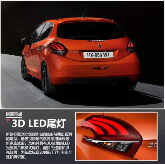 将视线转到新车的尾部,饱满简洁的线条勾勒出圆润的造型。最吸引眼球的就是采用标致最新家族式设计风格并具有3D效果的LED光源狮爪痕样式尾灯。醒目的造型和点亮效果,为新款标致208提升了行车安全性和辨识度。尾灯的分布与后保险杠两端上扬的线条,使新车的尾部形成一张笑脸,十分俏皮。此外,在排气布局方面,标准版本车型上采用了隐藏式的排气;GT Line车型为单边单出加镀铬罩;GTi车型则是单边双出加镀铬罩。在排气样式方面笔者认为略显平淡,并没有为新款标致208增加太多的运动气息。