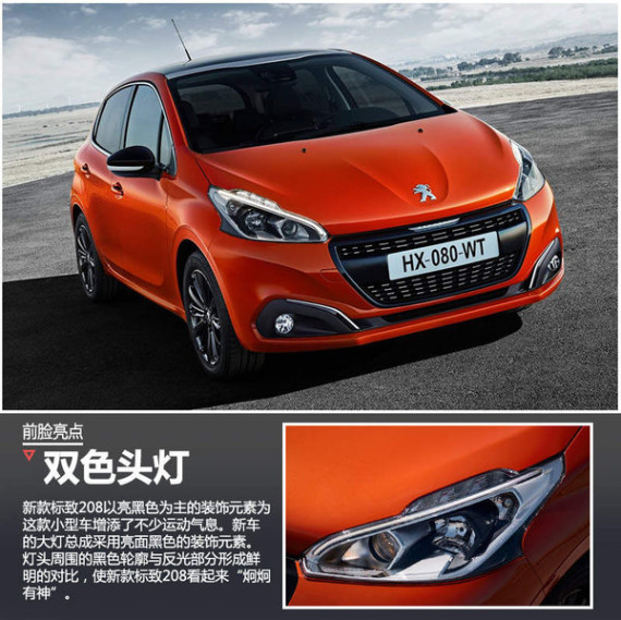 在外观方面,新款标致208在很多细节上采用了与车身异色的处理,以亮黑色为主的装饰元素为这款小型车增添了不少运动气息。前脸部分,全新设计的保险杠提供了一个更加清晰、精确的肌肉线条。宽大的进气格栅加入矩阵式的镀铬装饰,造型十分新颖,与保险杠协调地融为一体。更值得一提的是,在新车的大灯总成当中也采用了亮面黑色的装饰元素。灯头周围的黑色轮廓与反光部分形成鲜明的对比,使新款标致208看起来“炯炯有神”。