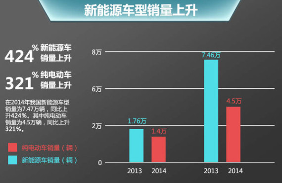 在2014年我国新能源车型销量为7.47万辆,同比上升424%。其中纯电动车销量为4.5万辆,同比上升321%。随着新能源车型越来越受到消费者的认可,中兴无线充电设备的普及,车辆充电不再是一个老大难问题,未来中国新能源车型的销量将进一步攀升。