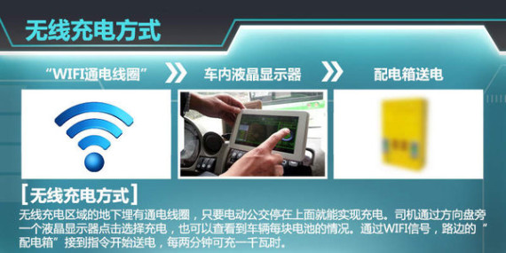 现阶段成都微循环无线充电公交的运行,为中兴把无线充电技术推广到全国起到了示范性作用。成都的公交站地面画着一个WIFI符号,据工作人员介绍,无线充电区域的地下埋有通电线圈,只要电动公交停在上面就能实现充电。司机通过方向盘旁一个液晶显示器点击选择充电,也可以查看到车辆每块电池的情况。通过WIFI信号,路边的“配电箱”接到指令开始送电,每两分钟可充一千瓦时。