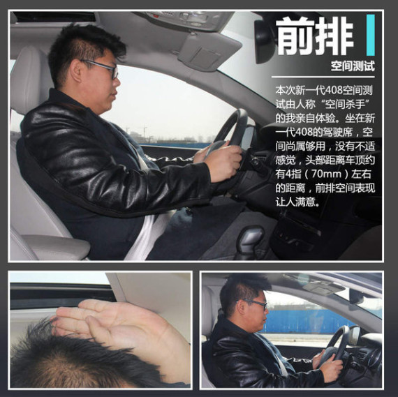 新一代408上市之初便以科技及空间作为宣传的热点,而本次我们针对该款产品的空间测试也由我这个“空间杀手”来亲自体验,本人身高181mm,体重大于200斤,由于这样的特体身材,大多数车型乘坐都很局促,所以我很少担任模特工作。不过这次例外,坐在新一代408的驾驶席,空间尚属够用,没有不适感觉,头部距离车顶约有4指(70mm)左右的距离。同时带有按摩功能的座椅,在出行途中无疑是个很好的功能。
