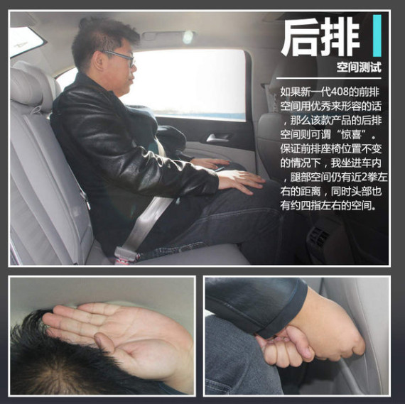 如果新一代408的前排空间用优秀来形容的话,那么该款产品的后排空间则可谓是“惊喜”。新一代408作为一款定位在国内紧凑型三厢轿车市场的产品,因此对于这款小车的后排空间我并没有很高的期望。不过保证前排座椅位置不变的情况下,我坐进车内,腿部空间仍有近2拳左右的距离,同时头部也有约四指左右的空间,让我感到十分满意。