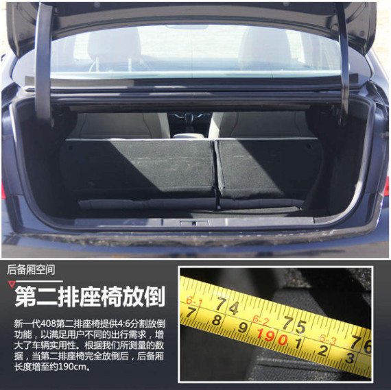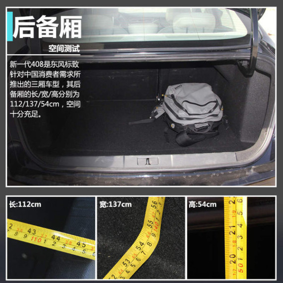 新一代408作为东风标致专为中国消费者开发的全新三厢轿车,后备厢自然也是针对空间评测的重要环节。根据我们的实测该款车型的后备厢长/宽/高分别为112/137/54cm,基本可以满足日常出行的需求。另外新一代408还提供了第二排座椅可放倒功能,进一步增加了车型后备厢的容积,可以放置尺寸更大的物品。