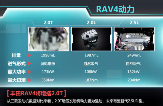 一汽丰田官方此前公布了2.0T引擎相应数据,最大输出功率为173kW,最大扭矩为350Nm,并且匹配8AT变速箱,动力输出远超目前RAV4所搭载的2.0L和2.5L两款自然吸气发动机。不得不提到的是,这款发动机百公里最低综合油耗为7.1L,与RAV4 2.0L车型(百公里综合油耗7.3L-7.6L)相比更低,未来该款引擎有望替代目前的2.5L发动机。