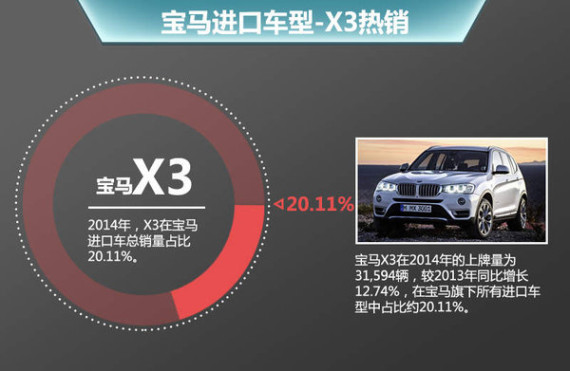 上述车型在以进口方式引入国内销售时,就获得了较高的关注度及销量。其中宝马X3是其进口车型中表现较不错的,该车在2014年的上牌量为31,594辆,较2013年同比增长12.74%,在宝马旗下所有进口车型中占比约20.11%。去年,福特进口车型在销量方面也表现出色,包括锐界在内的四款进口车全年总销量达到37,185辆,较2013年同期的26,856辆上升38%。