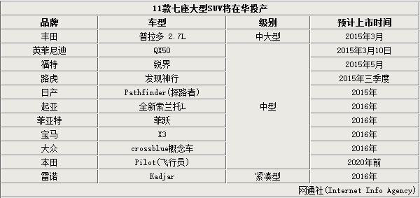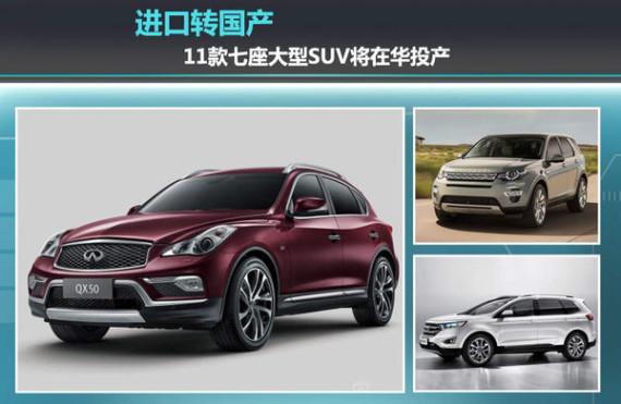 “空间大、多用途和高通过性”是消费者选择SUV车型的不二理由,再加上中国的“T”型家庭结构无不催生了“SUV热”。而在SUV领域中,七座SUV在空间方面更是略胜一筹,不仅保持了SUV的通过性,还有着MPV的大空间及灵活多用性,最能满足家庭的需求。近日,媒体对七座SUV车型梳理后发现,包括英菲尼迪QX50、福特锐界、路虎发现神行、丰田普拉多2.7L等在内的11款车型将在华投产。当然,国产之后也将为消费者带来更低的售价。