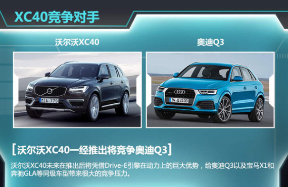 目前全球范围内的汽车市场在紧凑型SUV这一细分领域都呈现出上升态势,尤其是国内市场的火热程度大家有目共睹。而在豪华紧凑型SUV这一更为细化的市场定位上,奥迪Q3以高达53%的市场份额当之无愧地成为2014年国内市场同类产品中的销量冠军。沃尔沃XC40未来在推出后,将直接对标奥迪Q3以及宝马X1和奔驰GLA等同级车型。凭借着沃尔沃最新研发的Drive-E三缸及四缸引擎,XC40将在动力上获得很大的优势。该车在投放市场之后,将给上述对标车型带来很大的竞争压力。