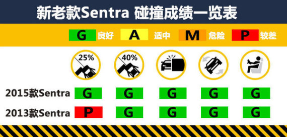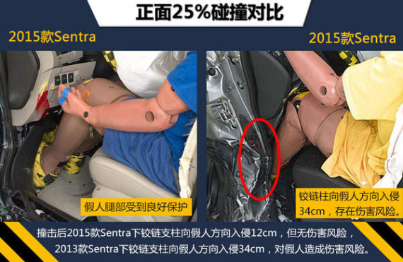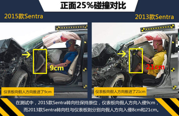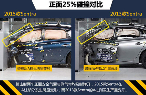 2015款Sentra在这次碰撞测试中各项成绩良好,特别是在最为严苛的正面25%碰撞测试中,各小项均取得最高评价,车内模拟驾驶员假人得到了全面良好的防护,因此摘得IIHS“2015最高等级安全评定”(2015 TOP SAFETY PICK)殊荣。而2013款Sentra在这项测试中总体评价只拿到“P”(较差),使车内乘员左腿、膝部及脚部遭受到不同程度的伤害,相比之下,2015款Sentra的碰撞测试成绩有了很大提升。